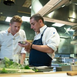 Hausherr Martin Klein und Gast Julien Royer bei der Menüplanung Im Dezember empfängt das Restaurant Ikarus im Salzburger Hangar-7 als letzten Gast-Koch des Jahres 2018 den...