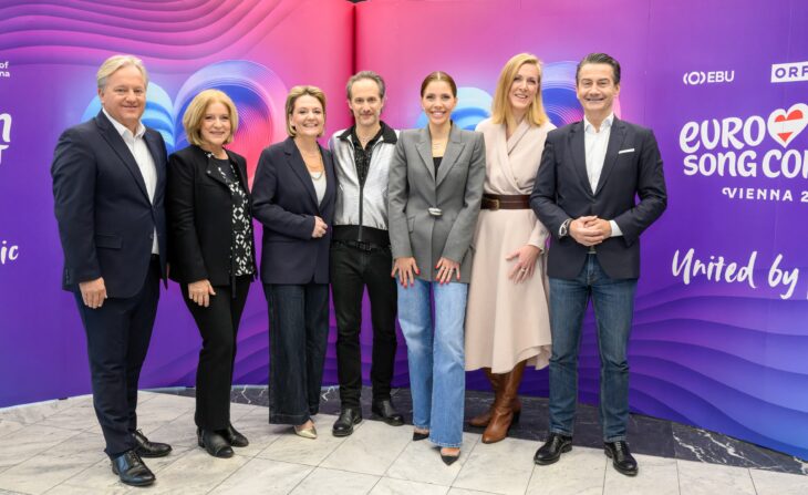 Harald Kräuter (Technischer Direktor des ORF), Ingrid Thurnher (ORF-Radiodirektorin), Stefanie Groiss-Horowitz (ORF-Programmdirektorin), Michael Ostrowski, Victoria Swarovski, Eva Schindlauer (Kaufmännische Direktorin des ORF), Roland Weißmann (ORF-Generaldirektor) berichten über die neuesten Entwicklungen bei der ESC-Vorbereitung. (Foto: ORF)