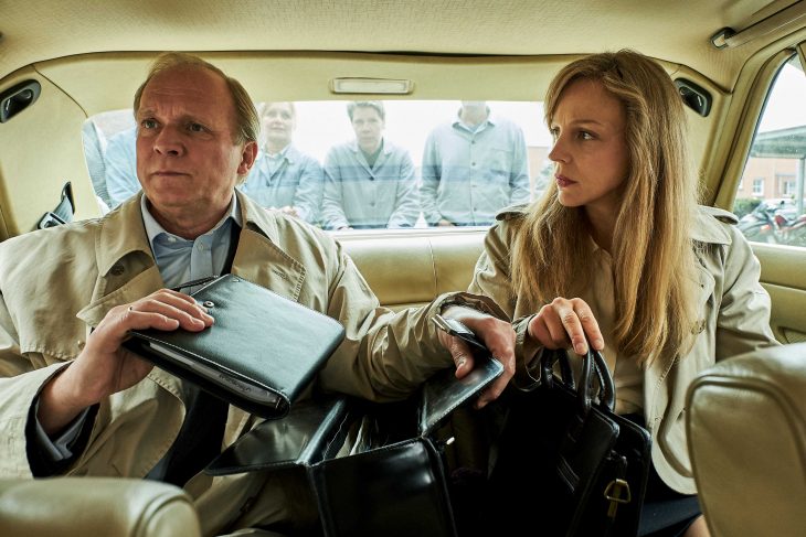 Der Vorsitzende der Treuhandanstalt Hans-Georg Dahlmann (Ulrich Tukur) und seine Assistentin Sandra Wellmann (Petra Schmidt-Schaller)